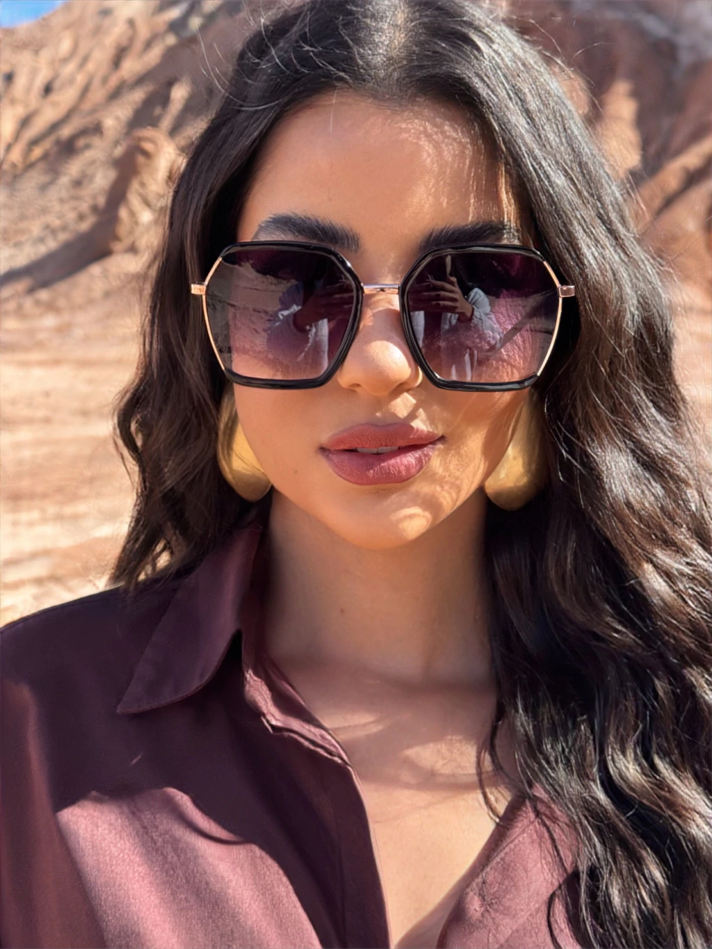 O Óculos de Sol Feminino DNY no formato maxi hexagonal, com armação em metal preto premium, é a escolha ideal para mulheres que desejam unir ousadia, elegância e presença em um acessório marcante. O design hexagonal extra-grande realça o olhar, enquanto a cor preta contemporânea transmite sofisticação e versatilidade — ideal para quem busca um acessório que combine com looks urbanos, casuais ou glamourosos.